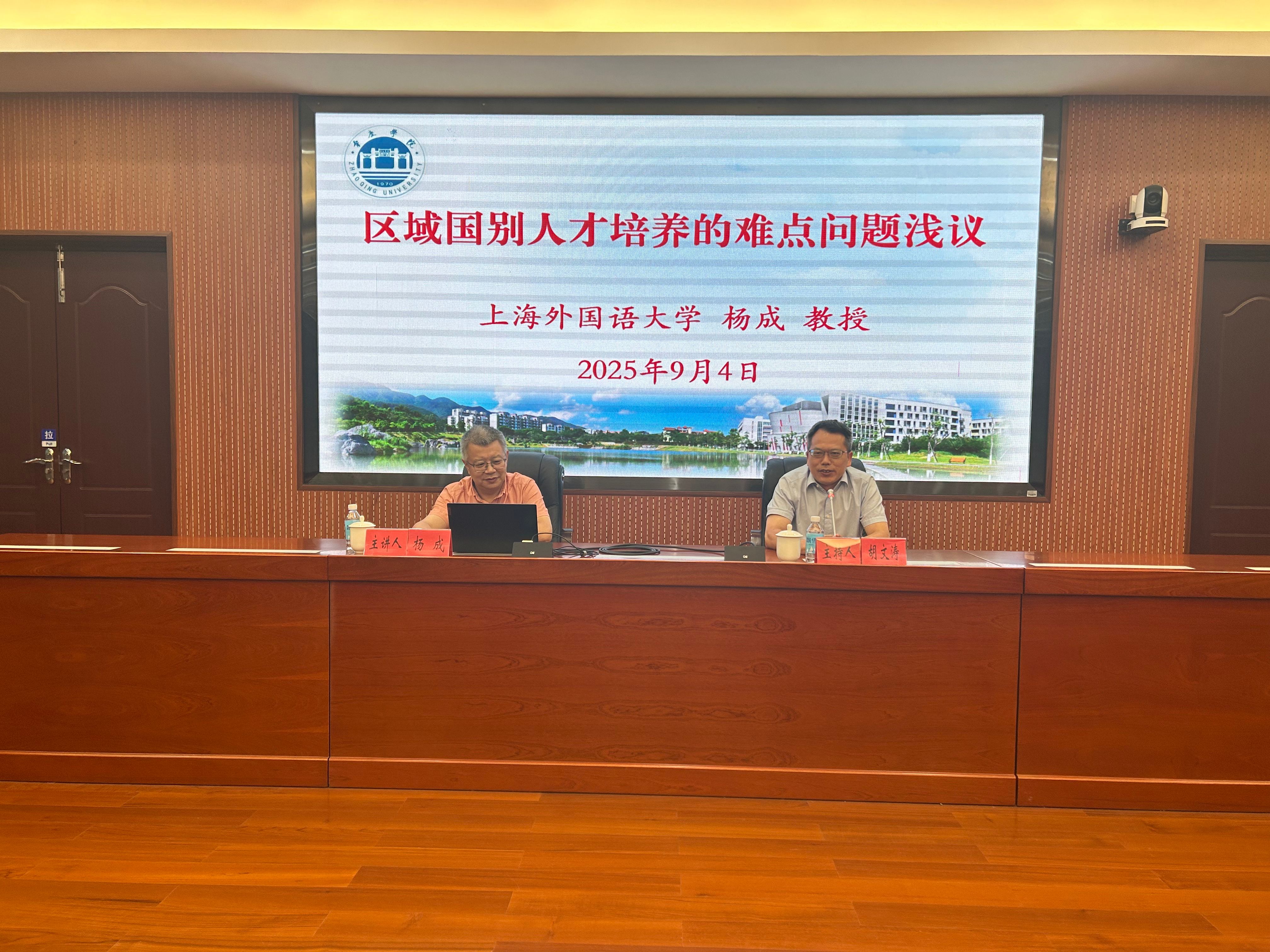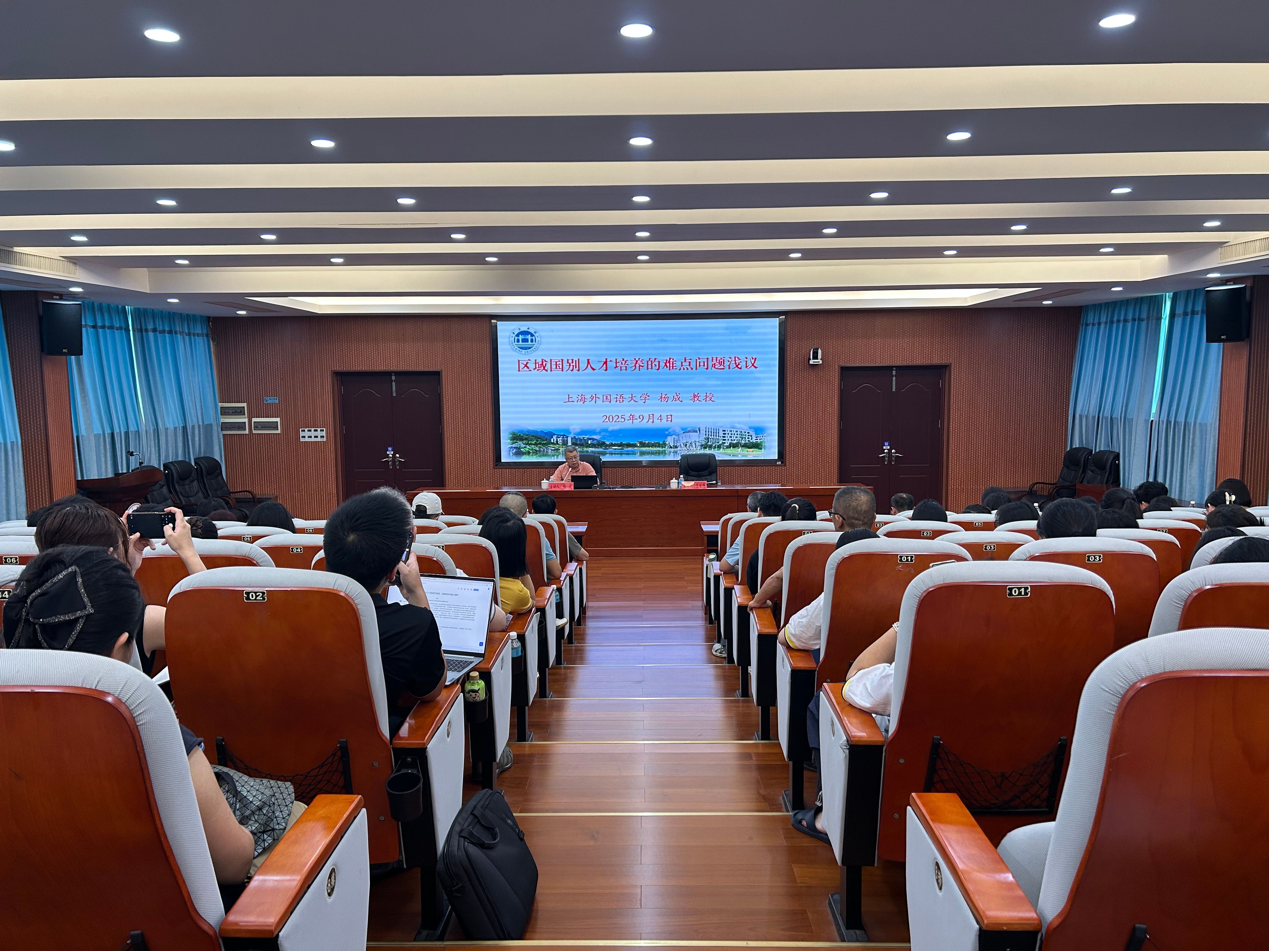 本网讯 9月4日下午,上海外国语大学全球治理与区域国别研究院执行院长杨成教授应邀莅临我校,以“区域国别人才培养难点问题浅议”为题开展专题讲座。副校长胡文涛、区域国别研究院教师、外国语言文化学院全体教师及学生代表参加讲座。讲座由外国语言文化学院主持行政全面工作副院长于增辉主持。