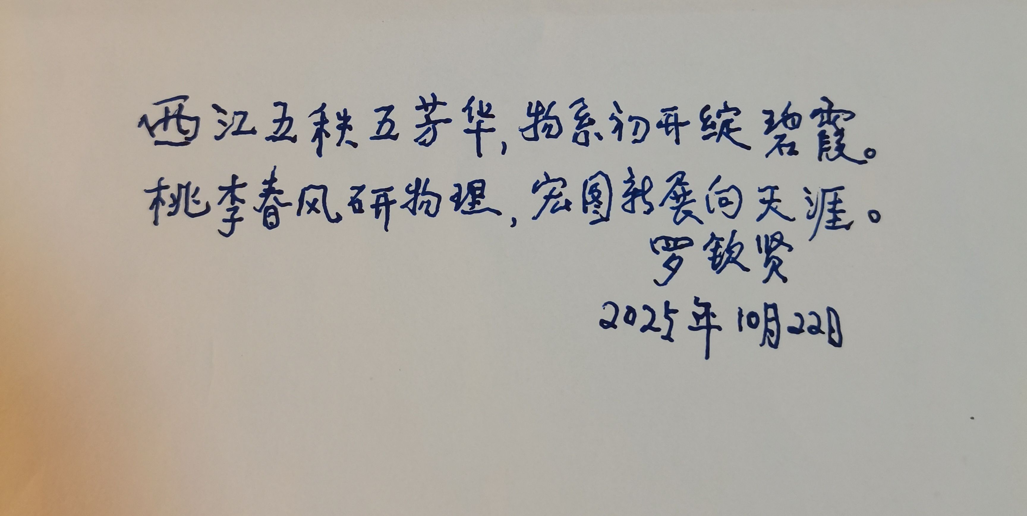 交流中,罗钦贤深情回忆了在物理系工作的难忘时刻,对物理系、学院取得的成绩表示欣慰,并对学院未来的发展充满信心,表示会继续发挥余热,支持学校、学院事业发展。随后,他还欣然提笔,写下了对学校办学55周年的祝福。