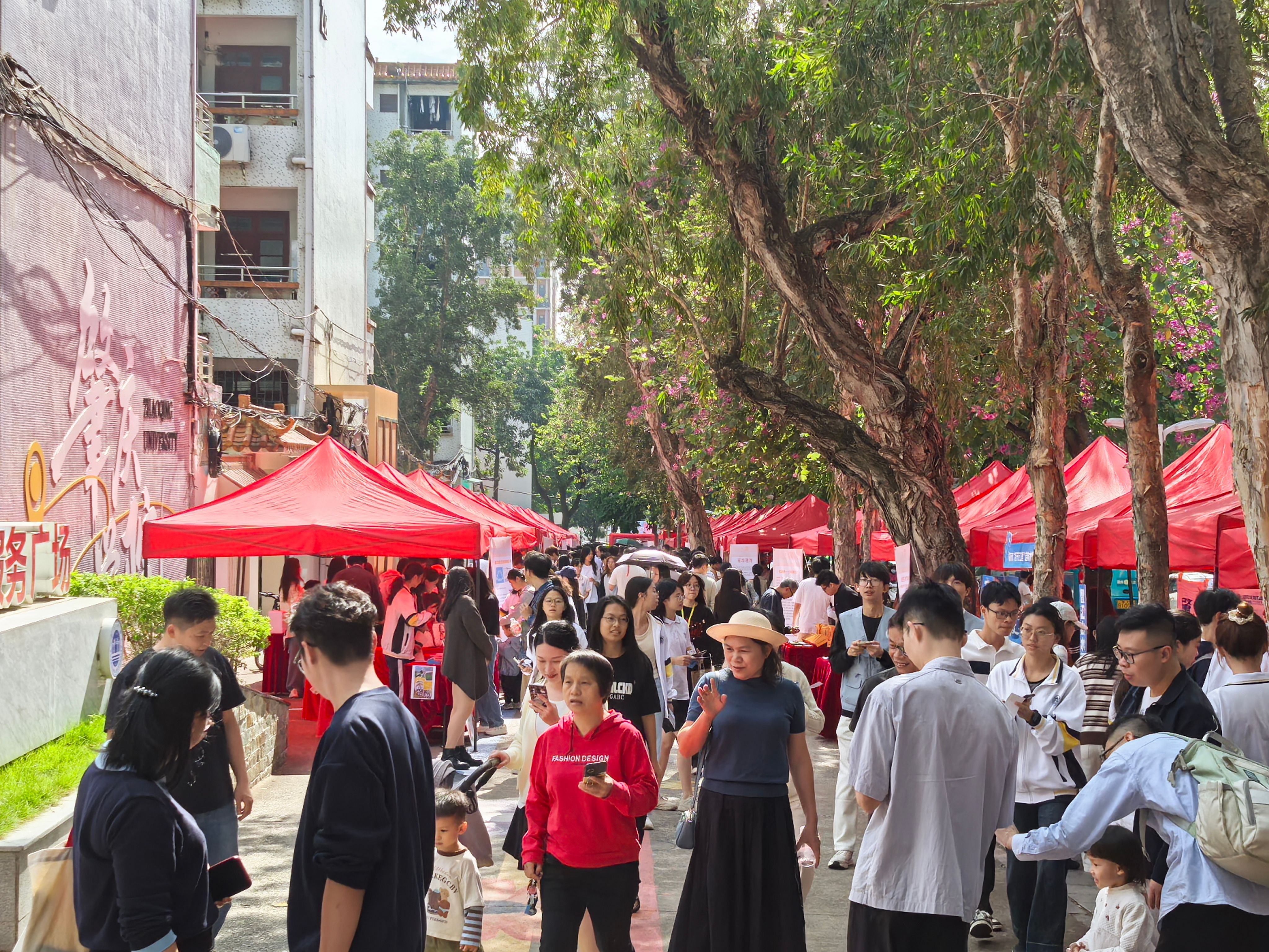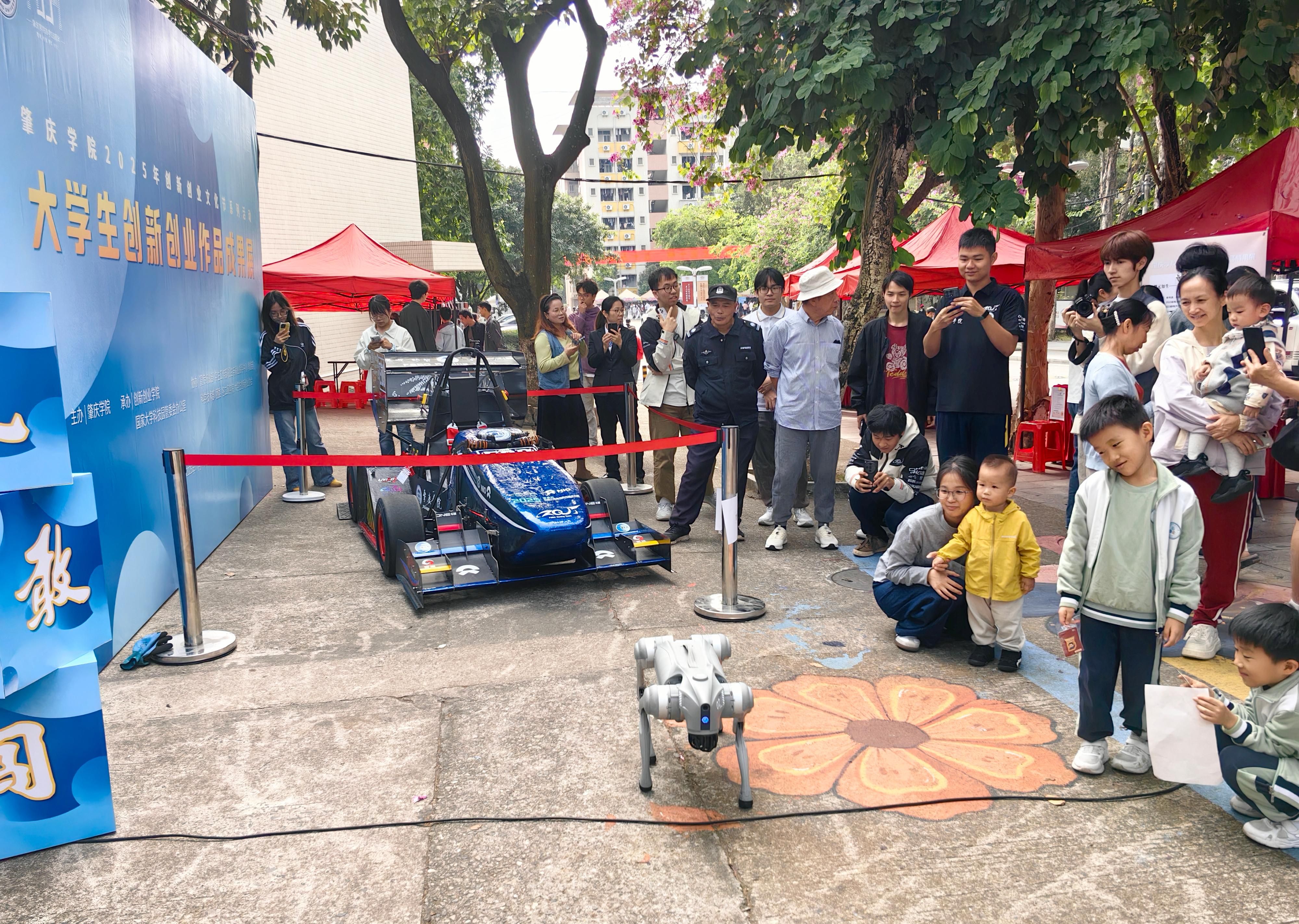 本网讯 11月15日,作为肇庆学院办学55周年高质量发展大会期间学校主要活动安排之一,一场别开生面的大学生创新创业作品成果展在紫荆校道和砚园创谷火热举办。近50个创新创业团队受邀集中展示我校大学生科技创新成果与创业实践风采,成果涵盖了电动方程式赛车、机器人、无人机、端砚雕刻、广府金绣等科技创新和文化创意项目。活动吸引了众多在校师生和返校校友逛展打卡,互动交流,成为大会期间一道靓丽风景。